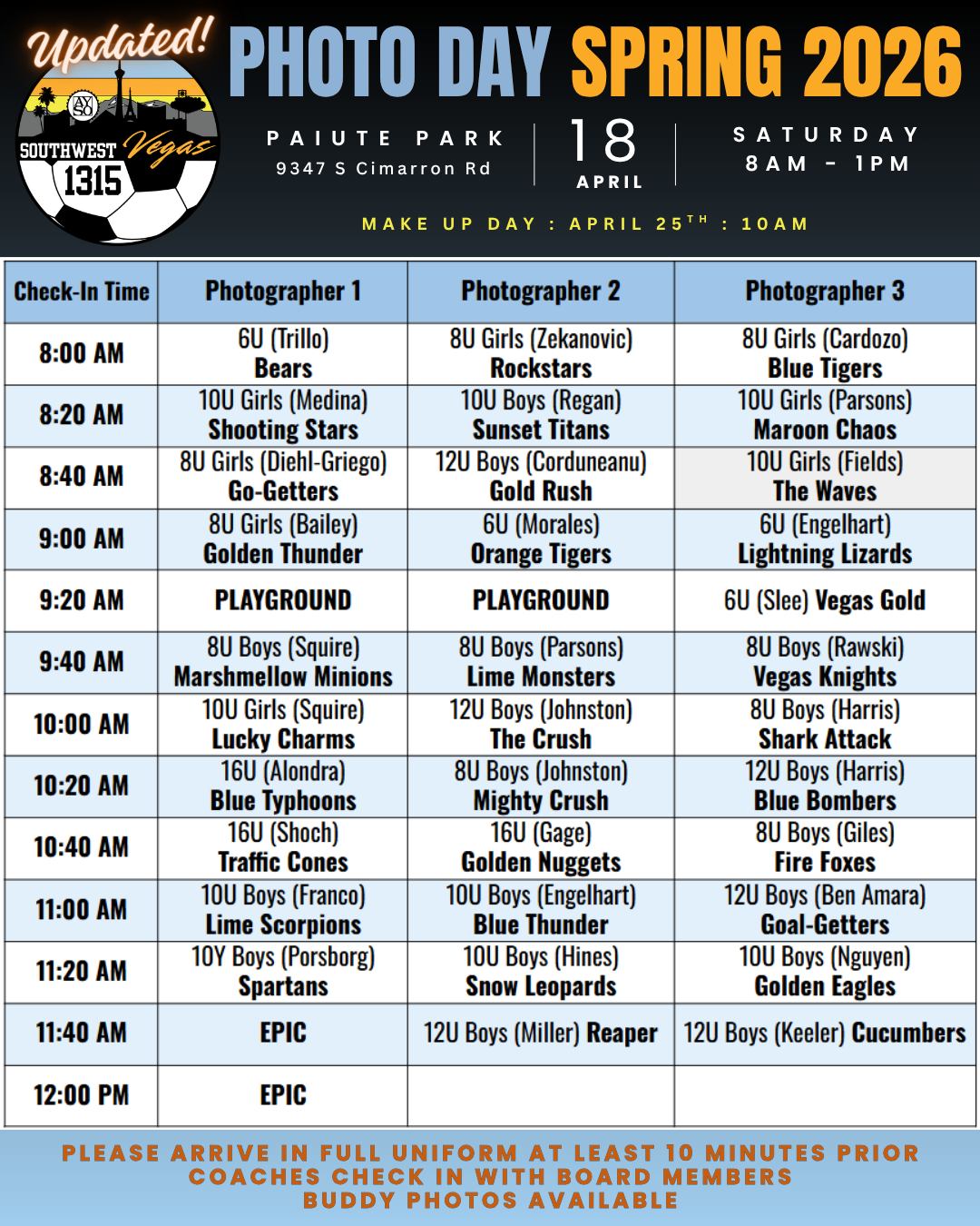 New Updates! Picture Day has been moved to 4/18 due to high winds forecasted. Please look below for your updated photo time.